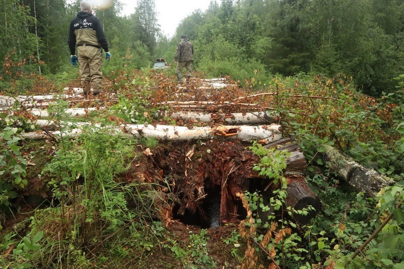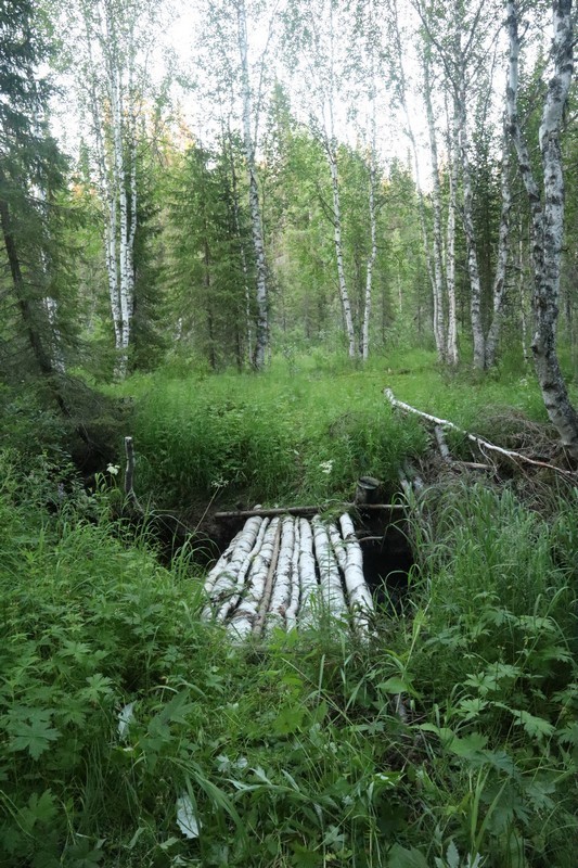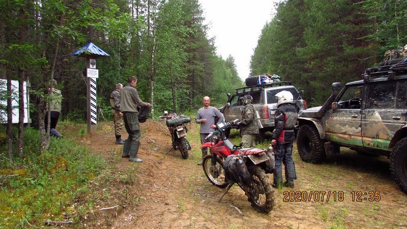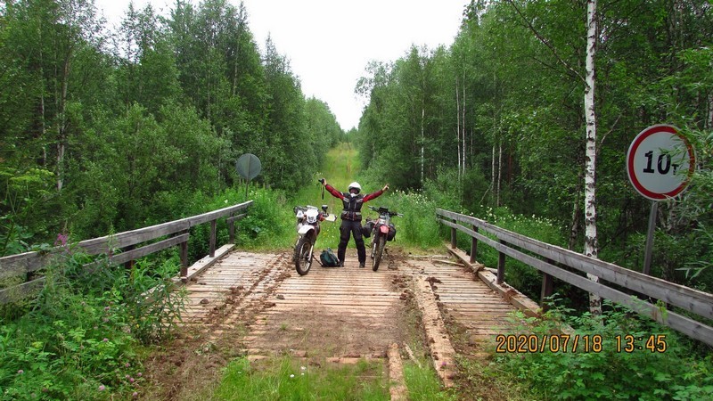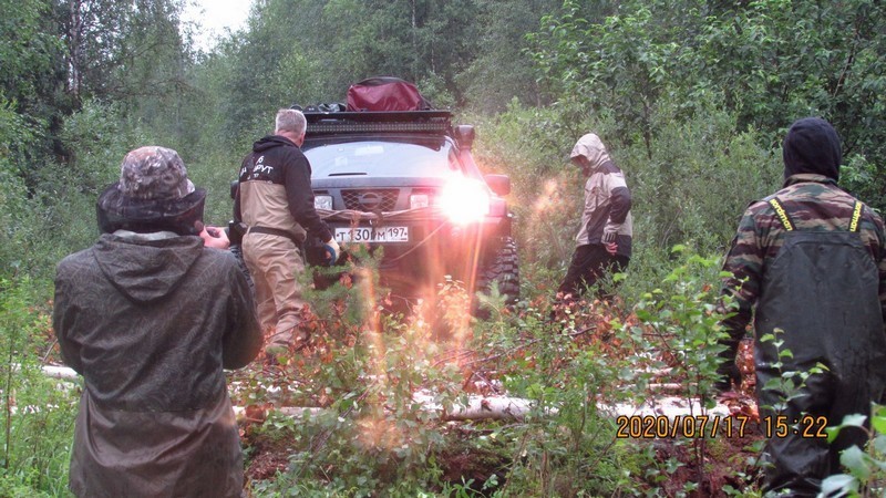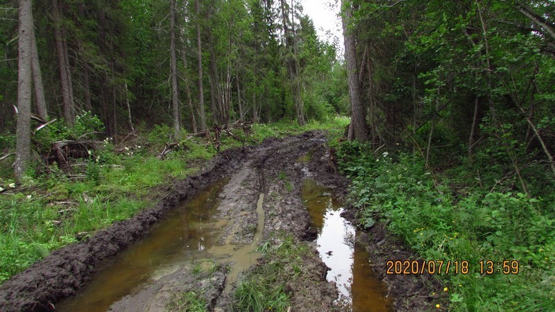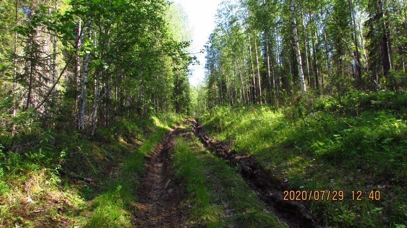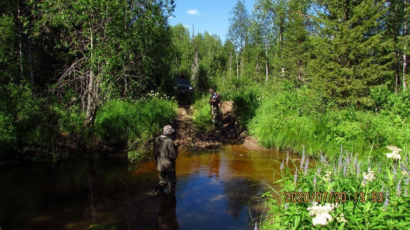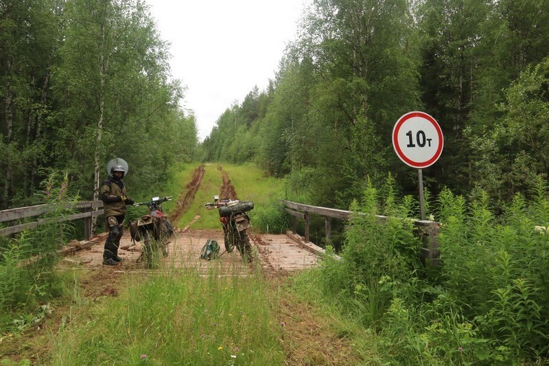 Через Цильму когда-то был здоровенный мост, но от него давным-давно лишь остов остался. Но колея подсказывает, где найти объезд. Перемахнули легко, разве что спуск крутоват показался. А вот дальше лес сильно изменился. Колея ГТС больше не мельтешит перед глазами, но дорога не заросла. Наоборот, деревья вдоль дороги аккуратно подрезаны. Типа чистили дорогу, но, судя по высоте пеньков, это было зимой, по снегу. Мы перемахнули в Архангельскую область. Болот стало меньше, больше мокрой колеи. Еще из засад – крутоватые ручьи стали встречаться. Сам ручей мелкий, а вот подъем на берег зачастую на лебедке. Один раз и мы не въехали, уж больно круто. Но народу много и ребята помогли вытянуть мотики наверх. А так бы пришлось полиспаст разматывать.