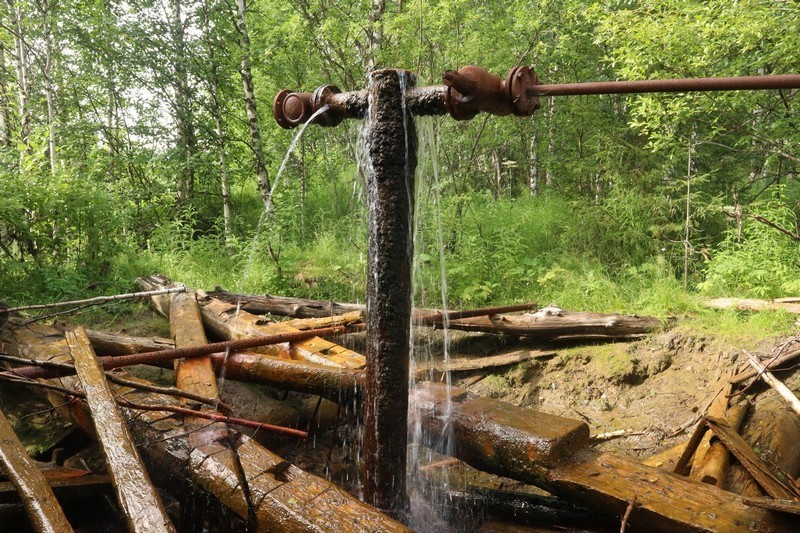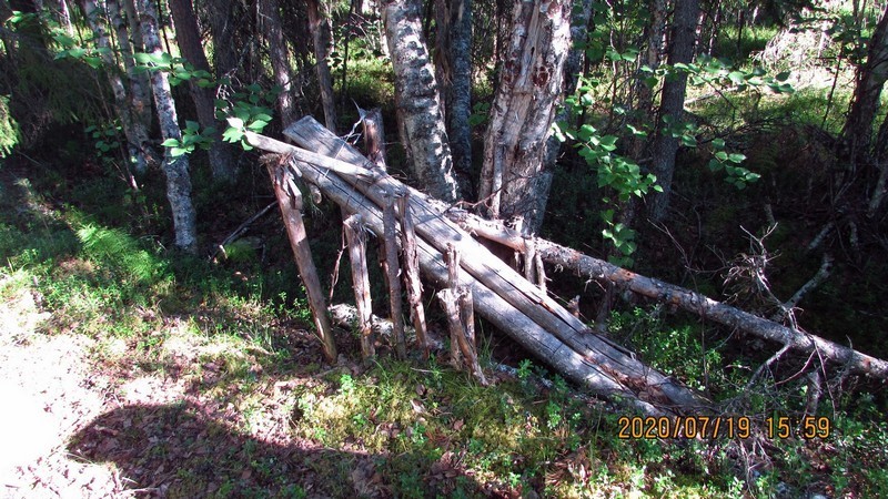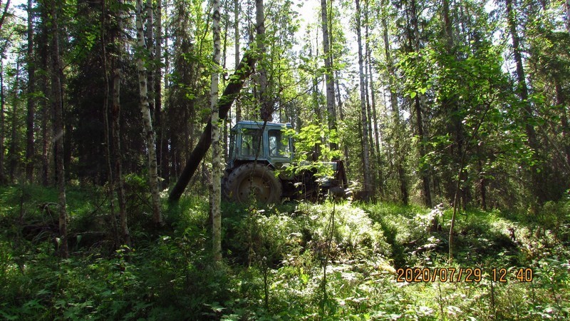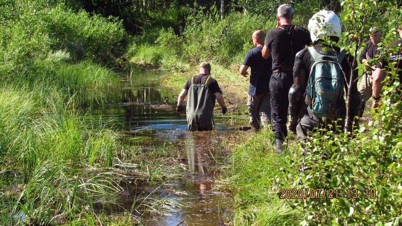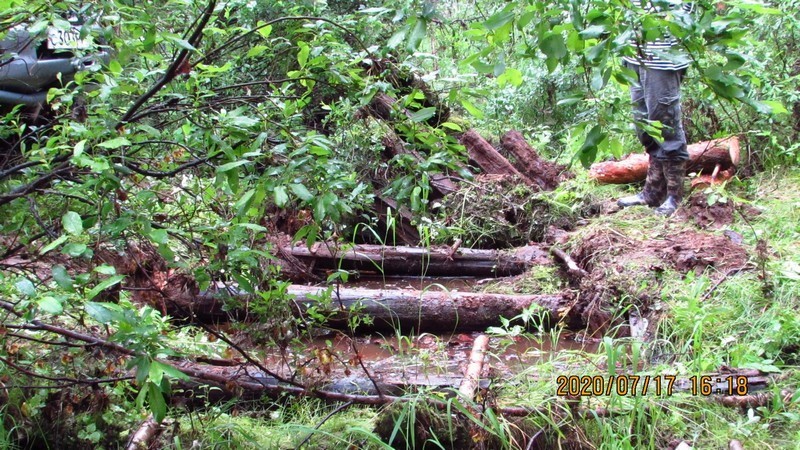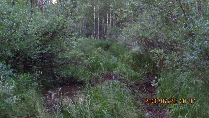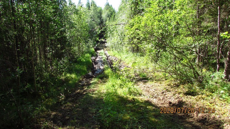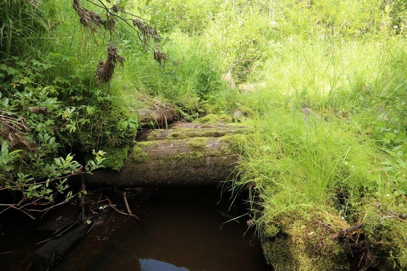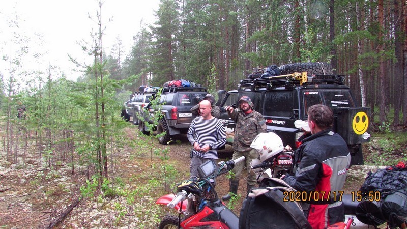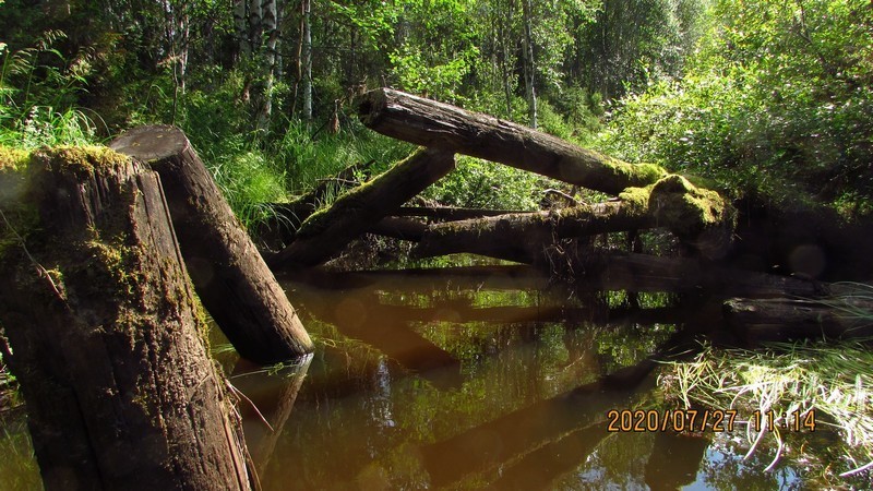 Через Цильму когда-то был здоровенный мост, но от него давным-давно лишь остов остался. Но колея подсказывает, где найти объезд. Перемахнули легко, разве что спуск крутоват показался. А вот дальше лес сильно изменился. Колея ГТС больше не мельтешит перед глазами, но дорога не заросла. Наоборот, деревья вдоль дороги аккуратно подрезаны. Типа чистили дорогу, но, судя по высоте пеньков, это было зимой, по снегу. Мы перемахнули в Архангельскую область. Болот стало меньше, больше мокрой колеи. Еще из засад – крутоватые ручьи стали встречаться. Сам ручей мелкий, а вот подъем на берег зачастую на лебедке. Один раз и мы не въехали, уж больно круто. Но народу много и ребята помогли вытянуть мотики наверх. А так бы пришлось полиспаст разматывать.