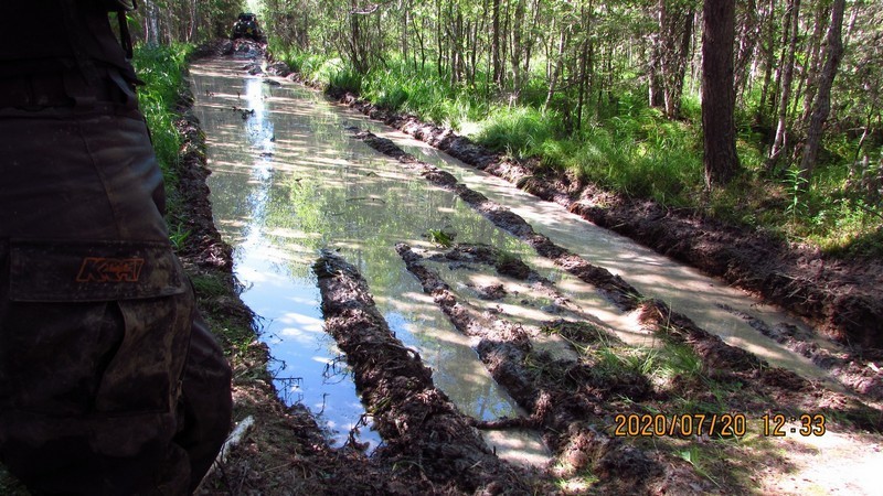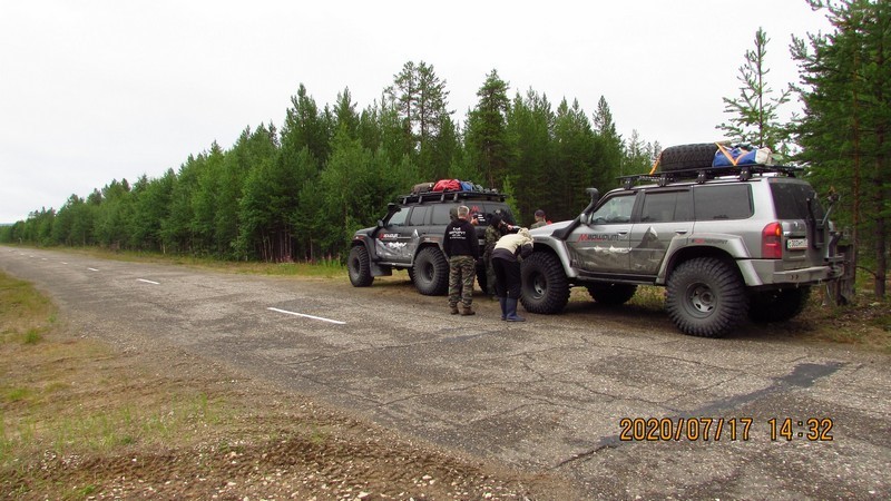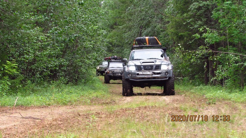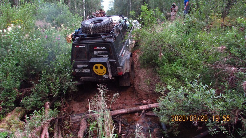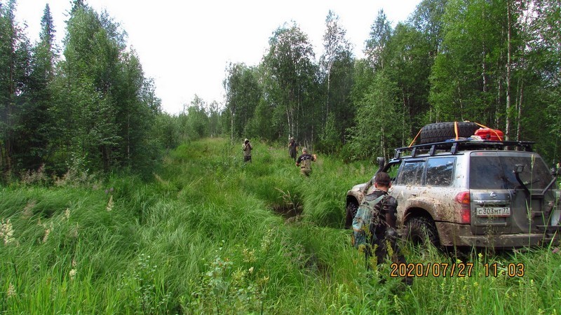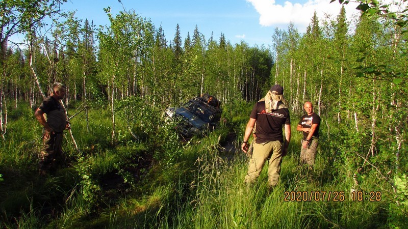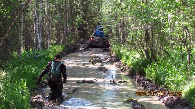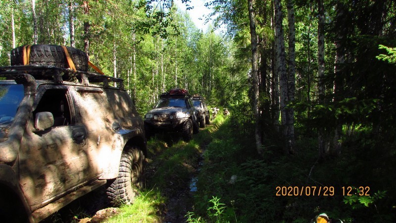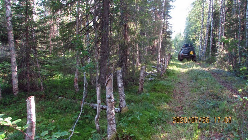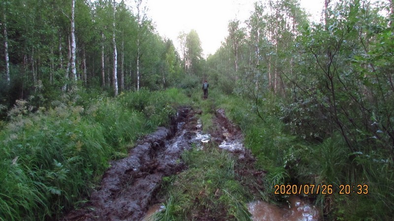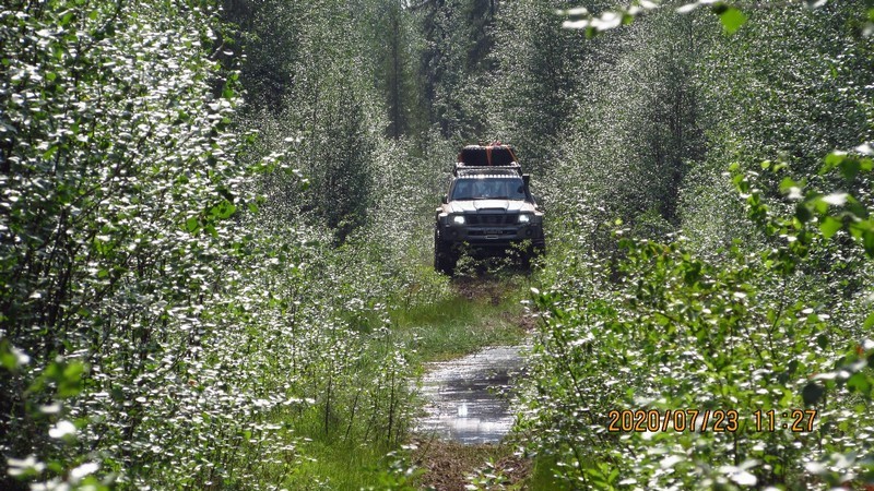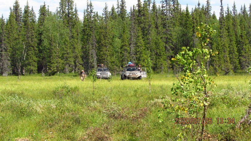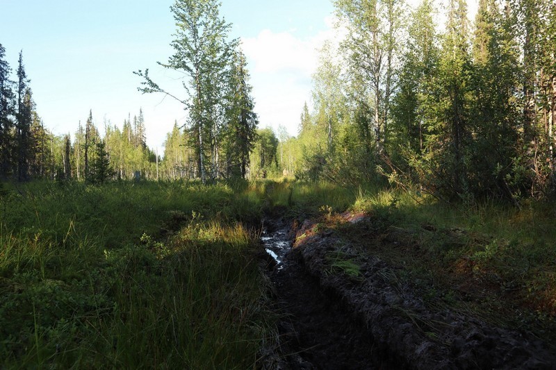 Сегодняшний жаркий день выдал нам 45,6 интересных километров тракта. Следов человека стало меньше, видимо сюда охотники уже не доезжают за ненадобностью. Сама дорога примерно такая же, как и вчера. Болота встречаются довольно часто, но все они короткие и с хорошим ковром. Ехать по ним одно удовольствие. Машины тоже вполне бодро идут. Все-таки размер имеет значение (они на 40 и 42 колесах). Мы практически нигде не засаживаемся. Правильный выбор траектории и правильная резина облегчают жизнь.