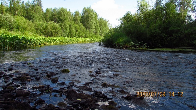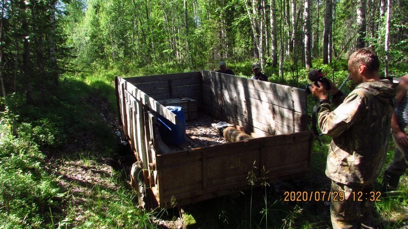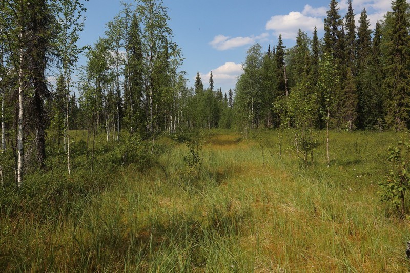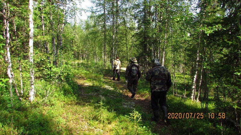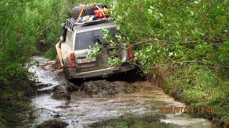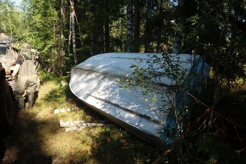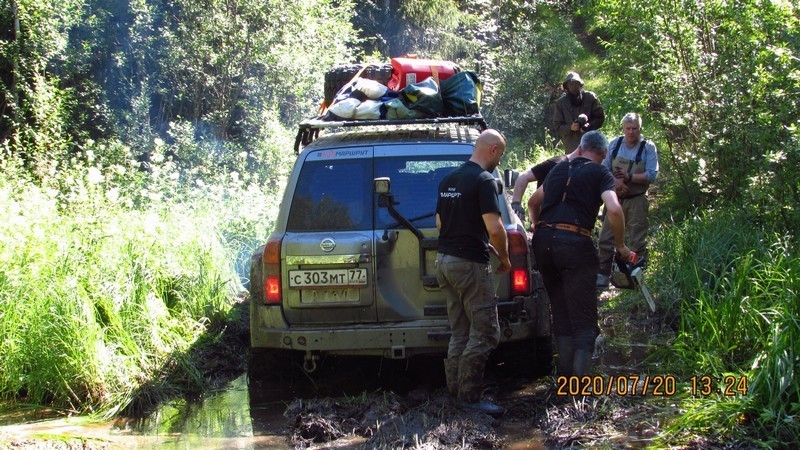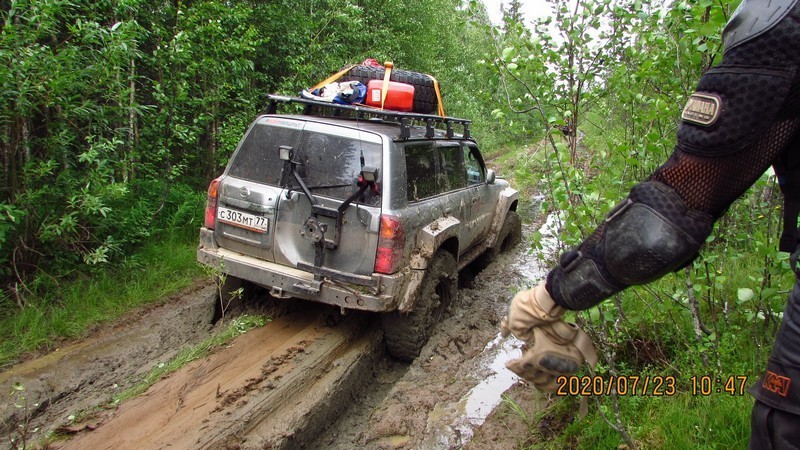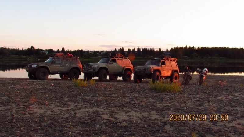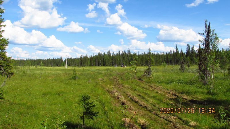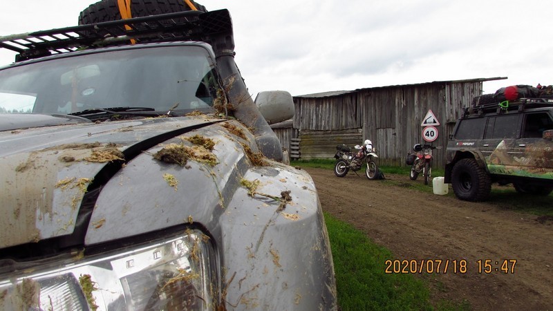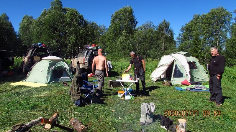 Сегодняшний жаркий день выдал нам 45,6 интересных километров тракта. Следов человека стало меньше, видимо сюда охотники уже не доезжают за ненадобностью. Сама дорога примерно такая же, как и вчера. Болота встречаются довольно часто, но все они короткие и с хорошим ковром. Ехать по ним одно удовольствие. Машины тоже вполне бодро идут. Все-таки размер имеет значение (они на 40 и 42 колесах). Мы практически нигде не засаживаемся. Правильный выбор траектории и правильная резина облегчают жизнь.