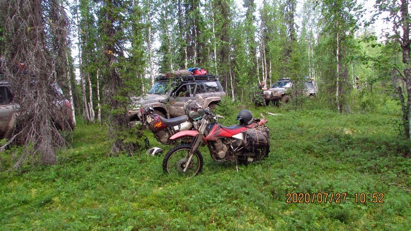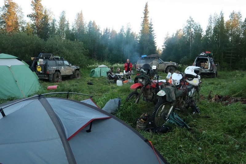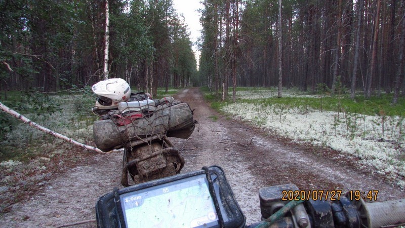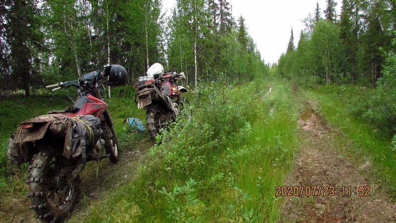 Сегодня мы прошли 14 километров. Сказать, что было очень сложно – наверное нет. Морально готовились к более сложной дороге. Но назвать ее простой тоже нельзя. Утром были глиняные подъемы, потом безмостные ручейки и лужи, и под конец нам выдали болото длиной 2 километра. Ехать по нему было тяжко. По колее нельзя. Она хоть и твердая (внизу гать), но местами глубокая настолько, что можно мотик утопить. А ковер на самом болоте пушистый и мягкий, по нему тяжело, но все же едется. Местами пришлось спешиваться, но в основном ехали. Под конец этого болота, когда мы отдыхали, объедая морошковые кочки, нас догнали машины. Они по утонувшей гати довольно комфортно ехали, главное – с нее не падать.