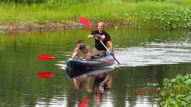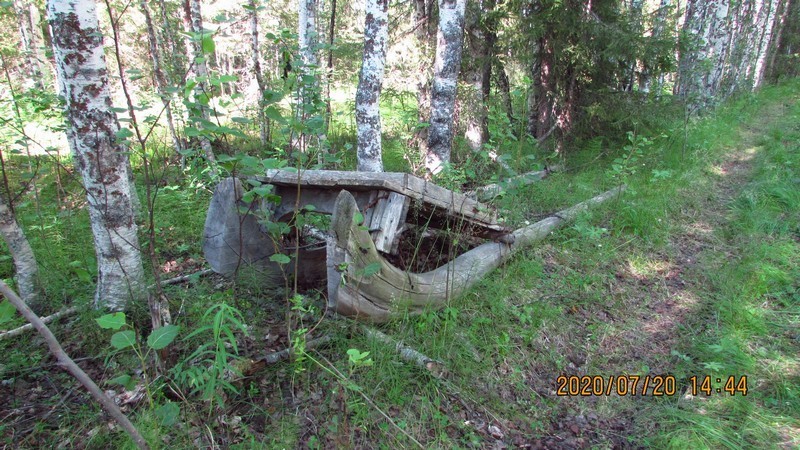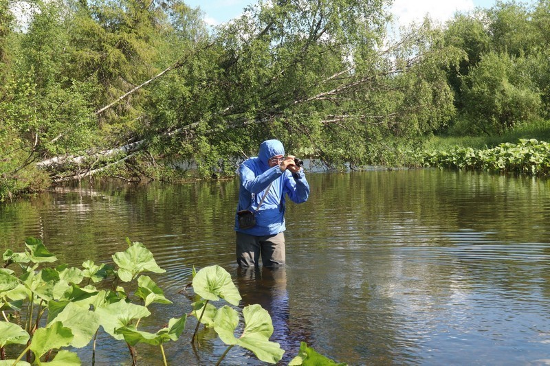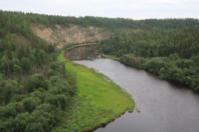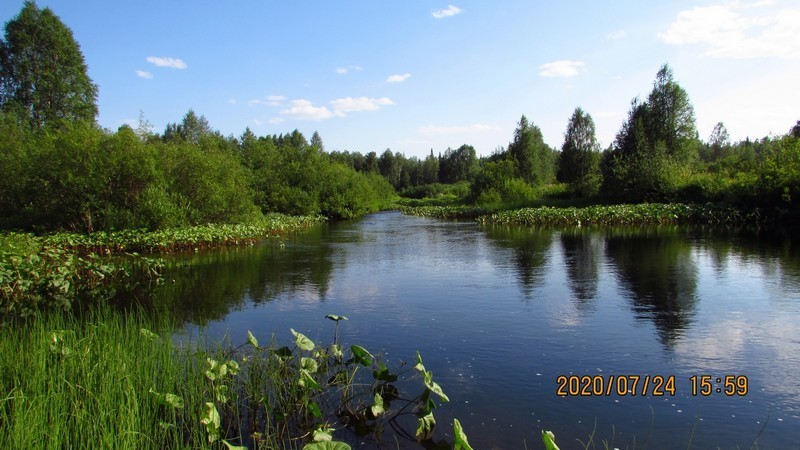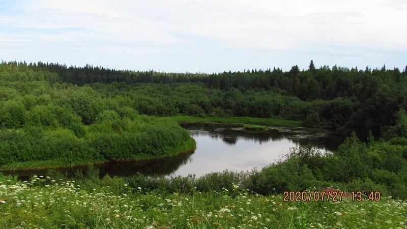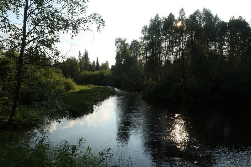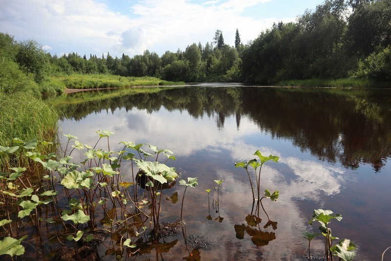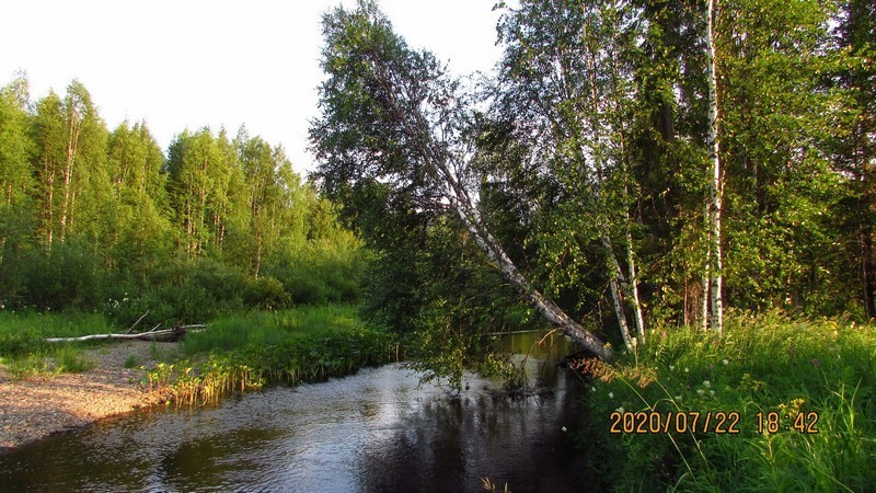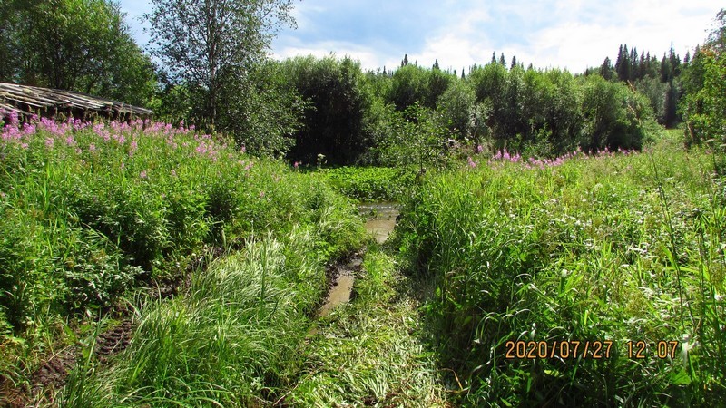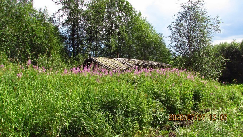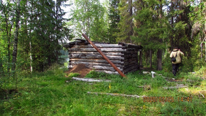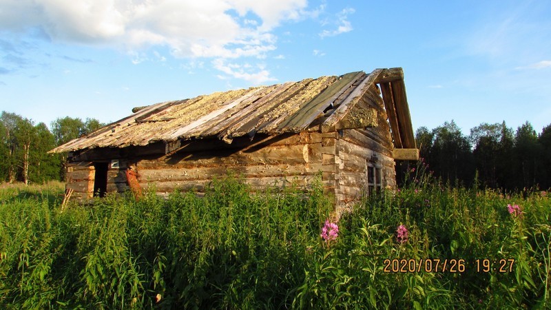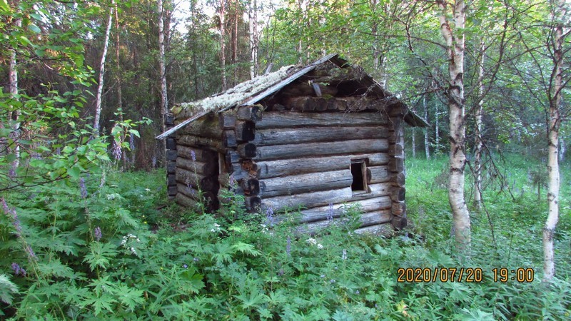 Алексей вновь пошел на лодке, ну а мы собирались на рыбалку, но узнав про избу в устье Ашуги и дорогу до нее, ни минуты не думая, повернули туда. Дорога вполне читаема, хотя уже подзаросла. Встретились нам остатки моста-настила на ручейке. Значит это не просто рыбаками пробитая колея, а настоящая дорога. Но вот засада, она нырнула в болото и потерялась. Нет чтобы вернуться назад и найти потеряшку, мы же, посмотрев в навигатор, ринулись напрямки к реке, ибо тут осталось все пару сотен метров. Но… это была ошибка… кочки высотой почти по пояс, между ними непонятая субстанция, в которую наступать совсем не хочется. Но река то рядом! Ползли-ползли и выбрались на берег. Но и он счастья не принес. Разве что водички попили. По реке идти не получается, отмелей почти нет. Берега наглухо заросли ивовыми кустами. Местами настолько все плотно, что приходится ползти прямо по кустам, по веткам. Они жесткие, даже до земли не прогибаются. А избы все нет и нет. Вои уже и Цильма. Широкая, ровная, еле шевелящаяся. Уже чуть было не отчаялись, но увидали избу. Еще метров 200 по ивняку, и мы у цели. Столько сил и времени потратили, а всего-то надо было вернуться чуть назад и поискать дорогу.