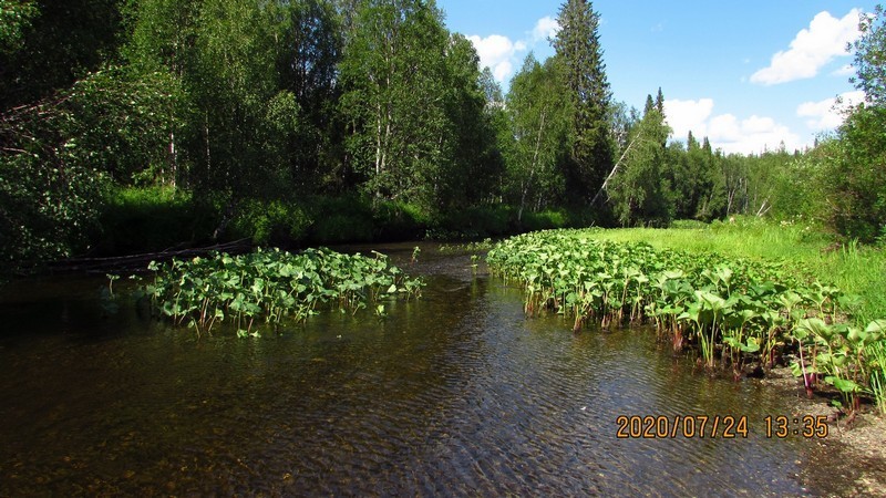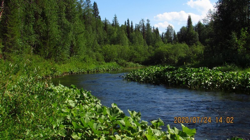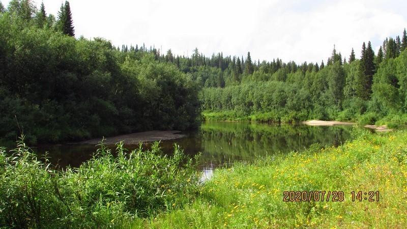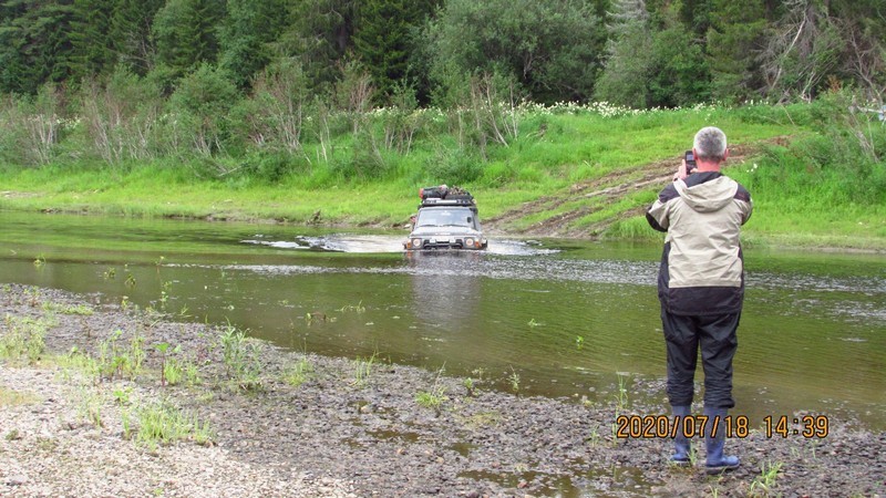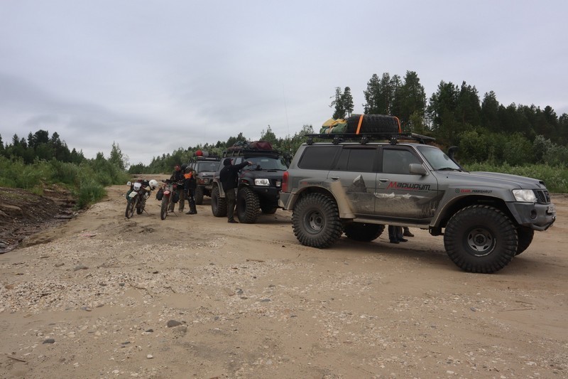 Пара болотинок, несколько ручейков, а так даже ничего дорога. Вышли на берег Усы. Здесь, по берегам реки были огромные покосы, даже остались стоять остовы стогов. Но, не то нынче время, трава до плеч…. Вода в реке чистая, прозрачная и теплая. Дно – мелкий-мелкий засасывающий песок. Идти по нему тяжело, но глубина позволяет аккуратно провести мотики. Ну а машинам что, у них шноркели!