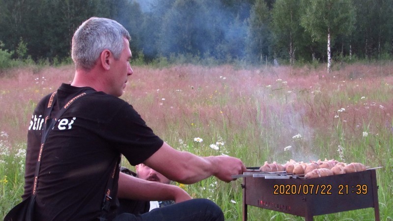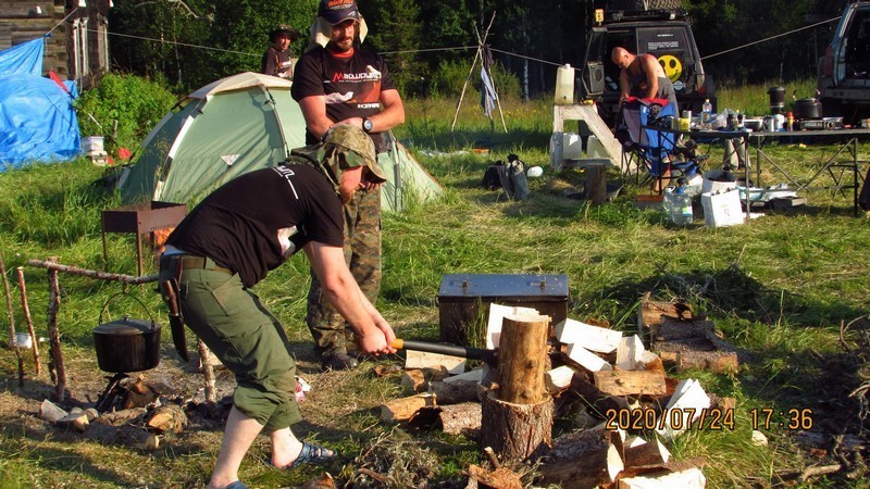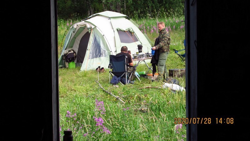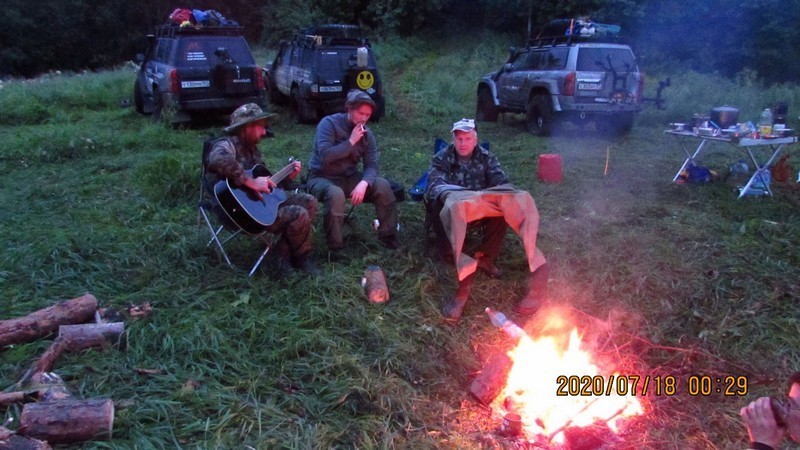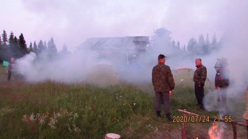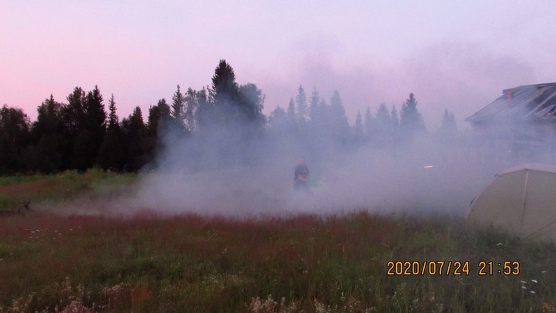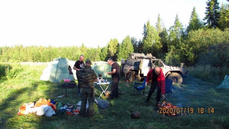 Комарья вроде и много, а вроде и нормально. Как солнце село, температура сразу вниз покатилась, как санки с горки. Но костер греет, и сушит. Дождя больше нет, и завтра уже обещают хорошую погоду. На поляне, где мы стоим, раньше была станция Усть-Усинская. Но ничего от нее не осталось, разве что память.
