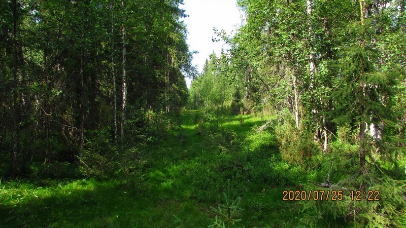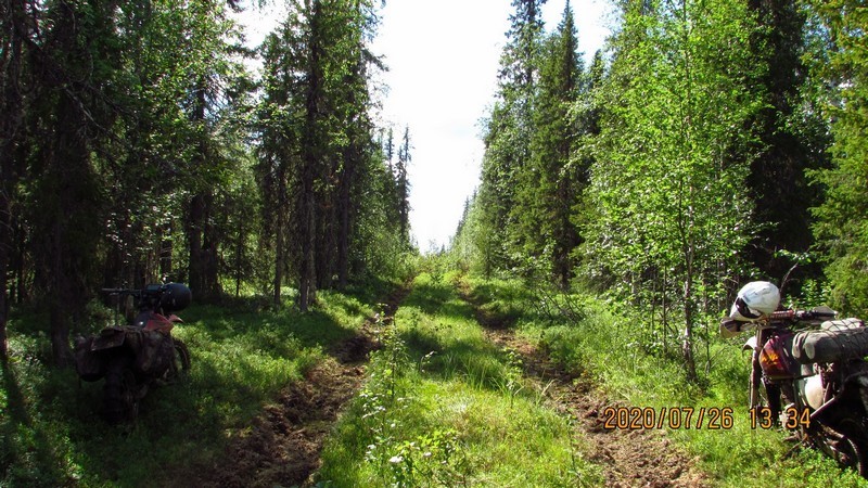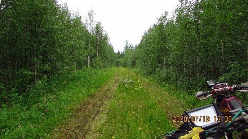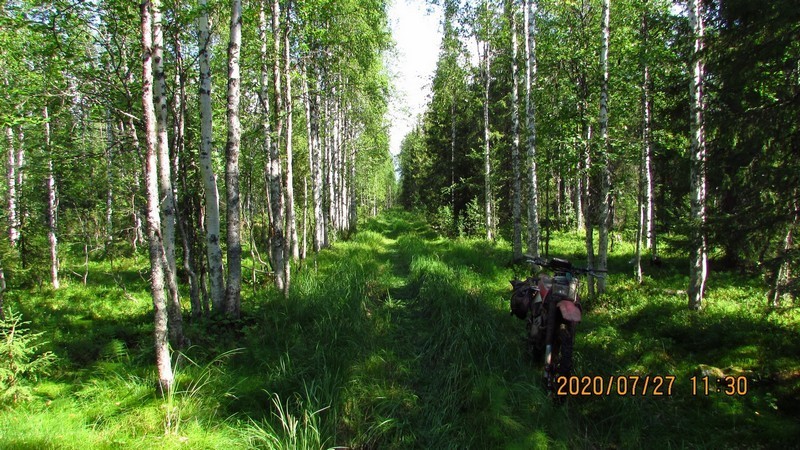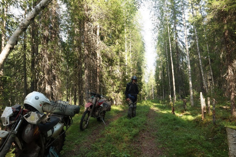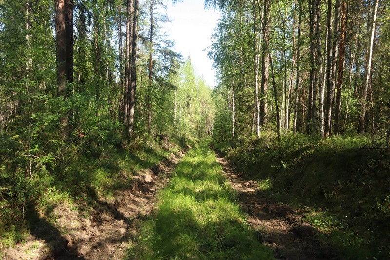 Ехали недолго, всего 15 км. Лес очень красивый, прозрачный. Дорога часто напоминает аллеи в старом парке. Мокрости конечно есть, куда же без них, но они все так же проходимы. В основном встречаются либо короткие болота, либо длинные колейные лужи. Все так же впереди маячит след ГТС, указывая путь. Надо сказать, что дорога не разъезжена. В смысле, есть только 2 колеи, между ними крепкая и ровная серединка без следов борьбы. Колея широкая, от ГТС, поэтому машины идут одними колесами в колее, вторыми – между, приминая траву. Много поваленных столбов ЛЭП и от того часто цепляем проволоку и наматываем ее на колеса. Машины выпутываем болторезом, мотики так, проворачивая колесо.