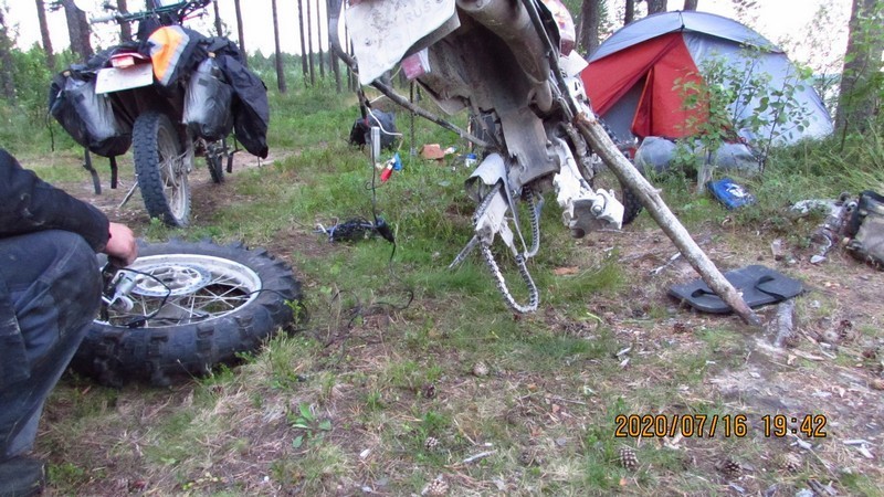 Мотоциклы HONDA, модели Baja и CRF230F. СЕРИЙНЫЕ. Установлены лишь багажники. Спереди и сзади обуты шины «Петрошина». Задняя шина т.н. «пятёрка» с прореженным протектором. Звёзды: XR250 – перед 12, зад 53 зуба; CRF230F – перед 11 зад 53 зуба (все они куплены в магазине). Цепи бюджетные, JT X-ring. По окончании похода замечены: на XR250 – некритичный износ цепи и ведущей звёздочки, на CRF230F – небольшой износ подшипников заднего и переднего колеса. И всё. Больше ничего не испортилось (прокол камеры не в счёт).