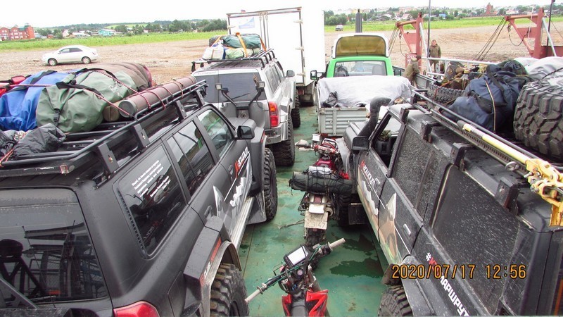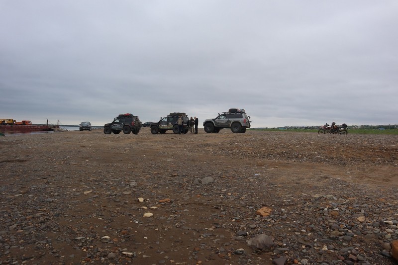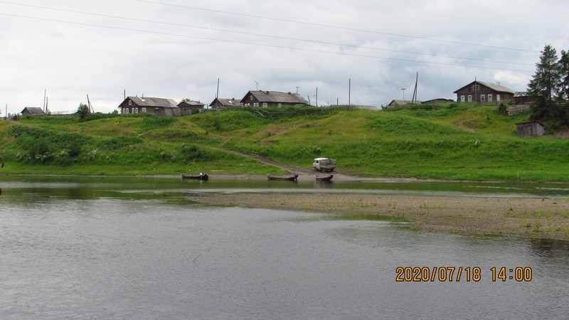 Второй паром, через Печору, ходит всего 2 раза в день. Ждать вечернего рейса совсем не хотелось, уговорили паромщика доп. рейс сделать. Несколько часов ожидания и загружаемся на палубу. Этот паром идет долго, огибая огромные песчаные отмели. А вот с той стороны опять пошел асфальт. Битенький, старенький, но вполне твердый. Может рано мы колеса переобули?