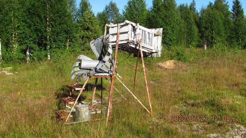 Вот что сохранилось от оборудования метеостанции: скрюченный ящик да упавшая колючая проволока по периметру.